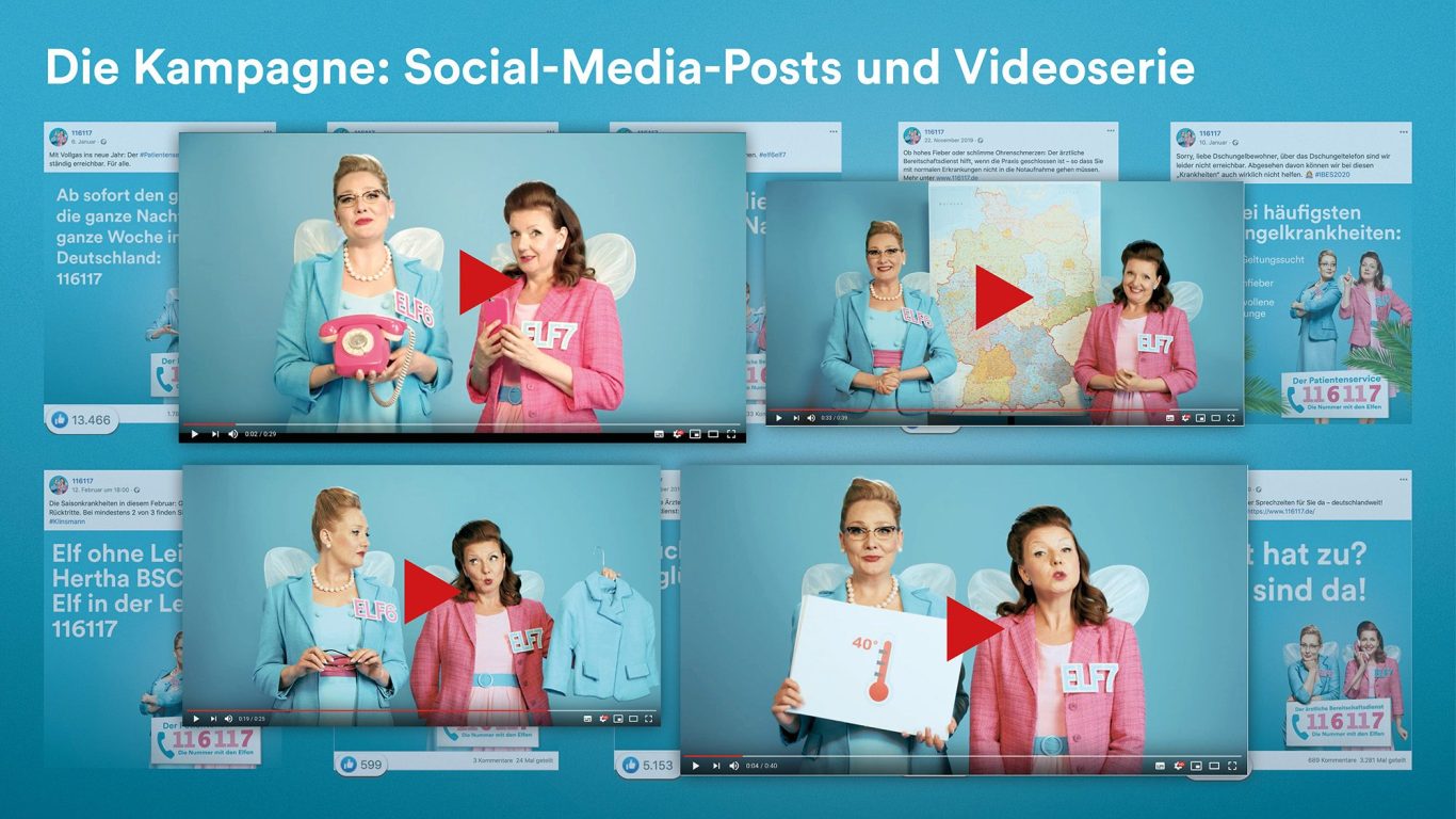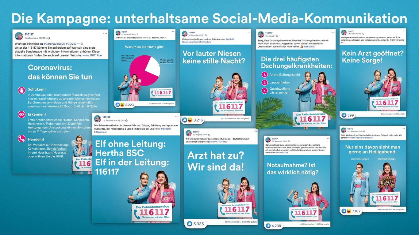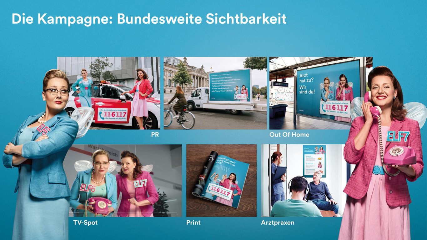 Die Kampagne "116 117 – Die Nummer mit den Elfen" der Kassenärztlichen Bundesvereinigung (KBV) macht bundesweit auf den ärztlichen Bereitschaftsdienst aufmerksam. Mit skurrilen Elfen-Spots soll die Nummer bekannter werden, damit Patienten bei nicht-lebensbedrohlichen Beschwerden außerhalb der Praxiszeiten Hilfe finden, statt unnötig Notaufnahmen zu belasten.