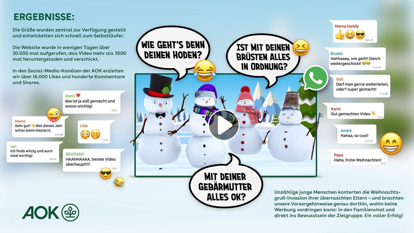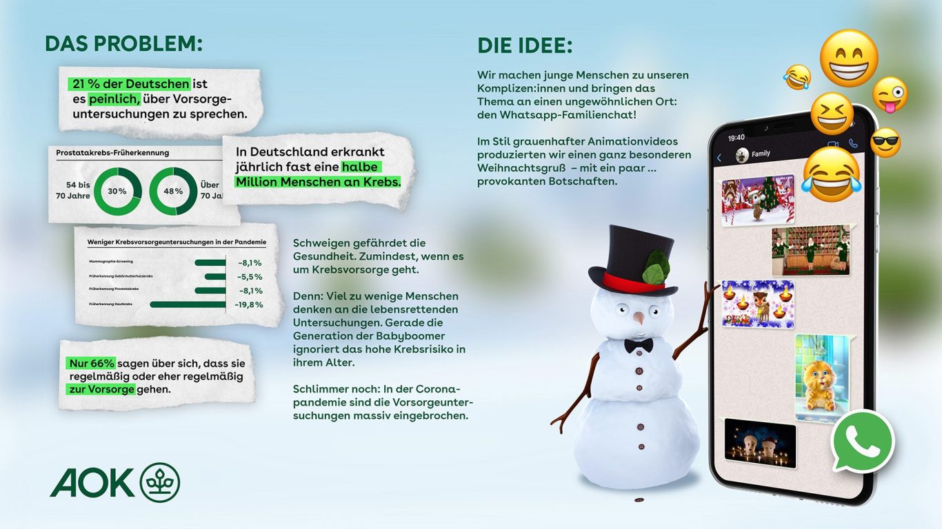 Besondere Herausforderungen erfordern eine besondere Idee: durch die Corona-Pandemie ist die Zahl der Termine zur Krebsvorsorge stark eingebrochen. Niemand spricht gern über dieses Tabuthema. Die AOK nutzt das Weihnachtsfest und eine List, um das Gespräch zur Krebsvorsorge wieder in Gang zu bringen und schleust die wichtige Botschaft an einen besonderen Ort: die Whatsapp-Familiengruppe!